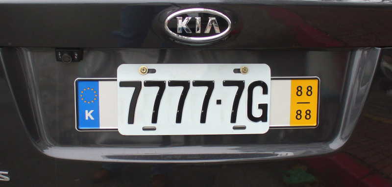 Korean car with Taiwanese license plate (edited to anonymise it) over EU license plate with (Portuguese??) numbers on the right, and Korea as country code.